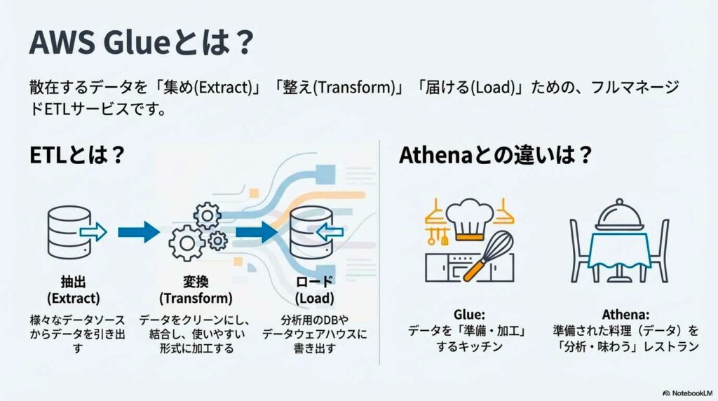 AWS GlueとAmazon Athenaは役割が明確に分かれています。Glueは、データを分析可能な状態に整える「データ準備」を担当するサービスです。一方、Athenaは、S3上のデータに対してSQLを実行する「データ分析(クエリ)」専用のサービスです。