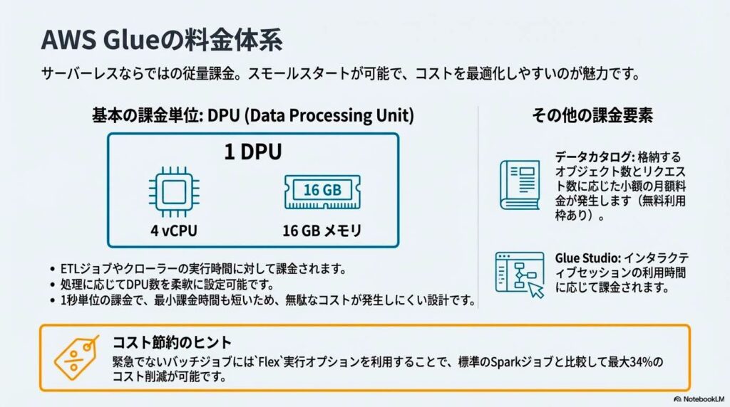 課金はDPU(Data Processing Unit)を基準に行われます。DPUはCPU、メモリ、ディスクI/Oを含む処理能力の単位で、ETLジョブやクローラーの実行時に消費されます。割り当てるDPU数が多いほど処理は高速になりますが、その分時間あたりの料金も上昇します。