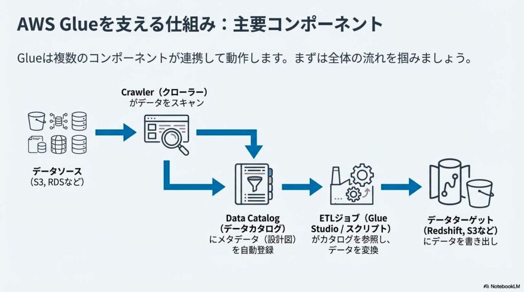 AWS Glueは、ETL処理を実現するために役割ごとに分かれた複数の機能で構成されています。データの構造を把握し、加工し、実行や管理を行うまでの工程を、それぞれ専用の機能が担います。ここでは、Glueを構成する主要コンポーネントと、その役割の違いについて解説します。