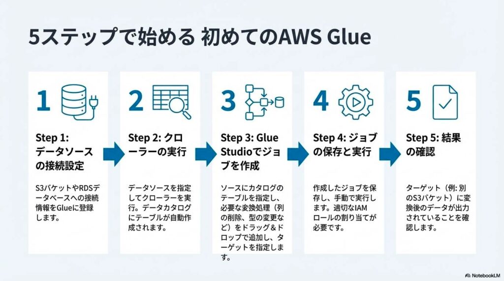 AWS Glueは画面操作を中心に処理の流れを作成でき、データ形式の変換やリアルタイム処理にも対応しています。ここでは手作業によるデータ準備の負担を減らし、効率よくデータ活用を進める方法を紹介します。