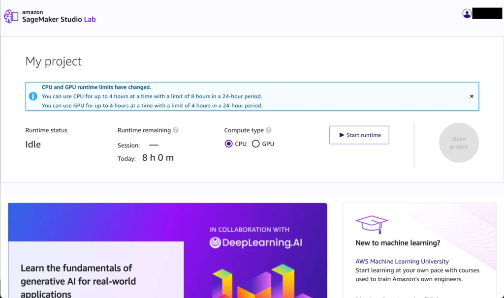 アカウントが有効になると、SageMaker Studio Labのダッシュボードにアクセスできるようになります。