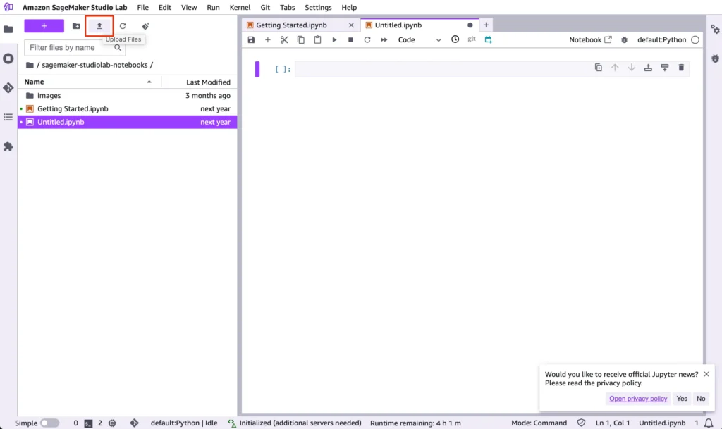 画面左側のファイルブラウザにある「Upload」ボタンをクリックし、ローカルPCからCSVや画像などのファイルを選択するだけで、Notebook内で読み込めるようになります。