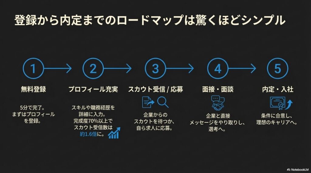 従来のように求人へ応募する形式ではなく、プロフィールを登録することで企業からスカウトが届く仕組みとなっており、転職活動の手間を大きく減らすことができます。