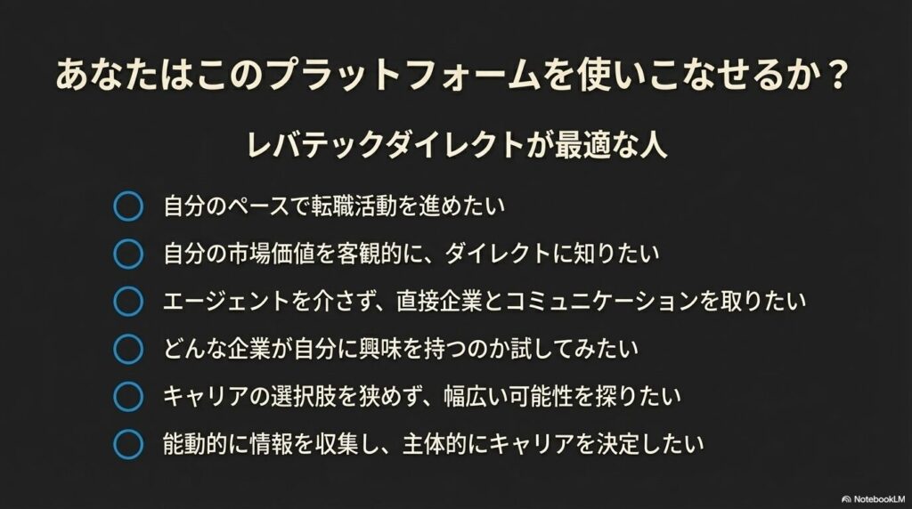 レバテックダイレクトは、求職者のニーズに合わせた柔軟な機能とサポート体制が整っており、特に次のような方におすすめです。