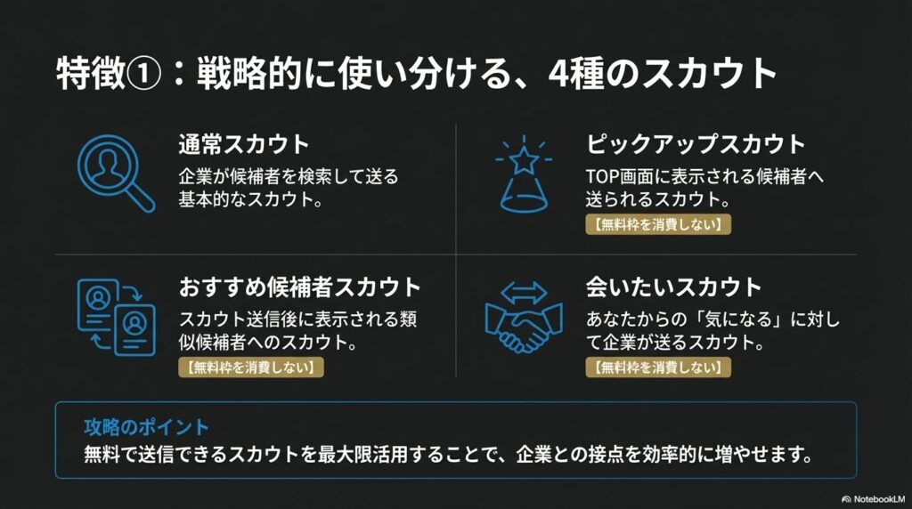 また、利用者数も多く、企業側もサービスに慣れているため、スカウトの精度や対応も安定しています。