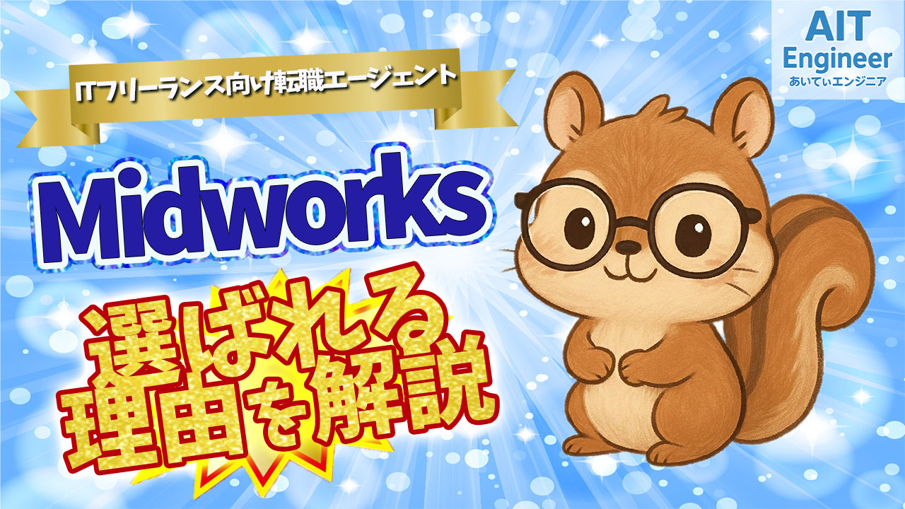 Midworks(ミッドワークス)は、フリーランス向けのITエンジニア専門エージェントサービスです。正社員のような安定性と、フリーランスの自由度を両立できるサービスを目指しており、案件紹介から福利厚生、税務支援まで、幅広いサポートを提供しています。