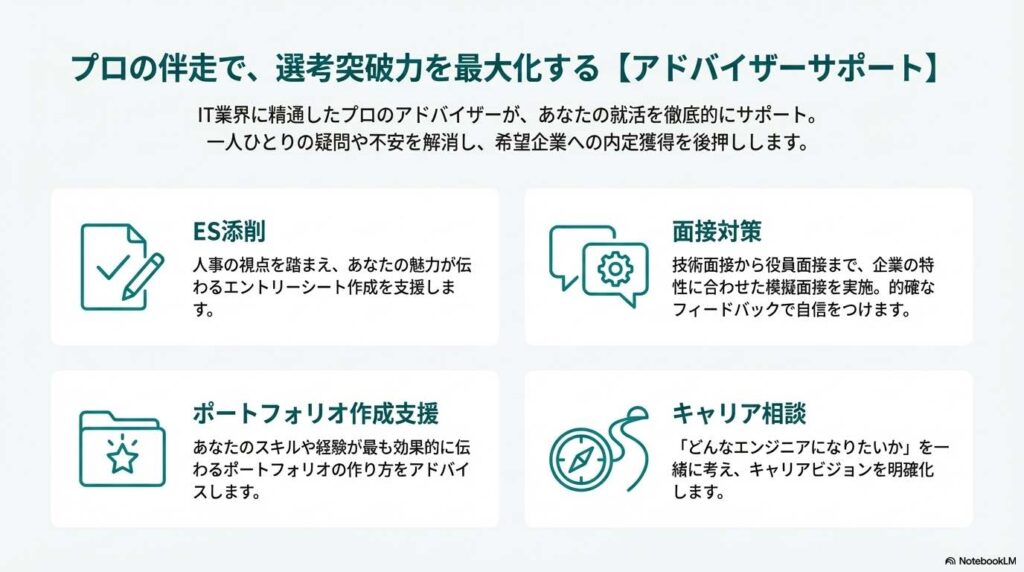 サービスの核となるのは、IT業界に精通した専任の就活アドバイザーです。
