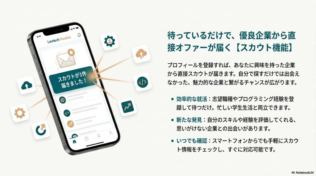 後述するスマートフォンアプリや専用のマイページを通じて、スカウトの受け取りや選考状況の管理がスムーズに行えるよう設計されています。