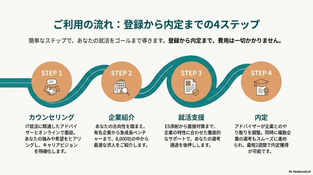登録から内定までのステップは非常にシンプルです。