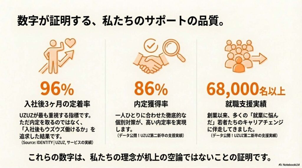 その結果、uzuzIT経由で入社した方の半年後の定着率は97%以上という驚異的な数値を叩き出しています。これは、「ただ就職させる」のではなく「入社後にその人が幸せに働けるか」を第一に考えている証です。