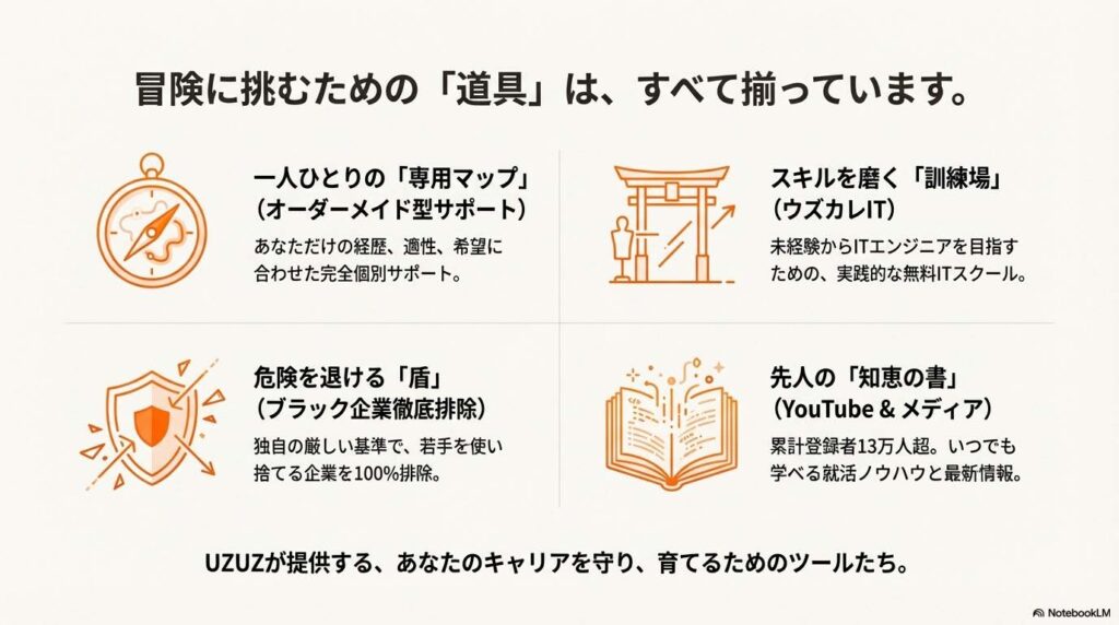 uzuzITは、単なる転職エージェントではありません。「ITスキルという武器」と「自信」を授け、20代の若者が自立して生きていくための「学校」であり「伴走者」です。
