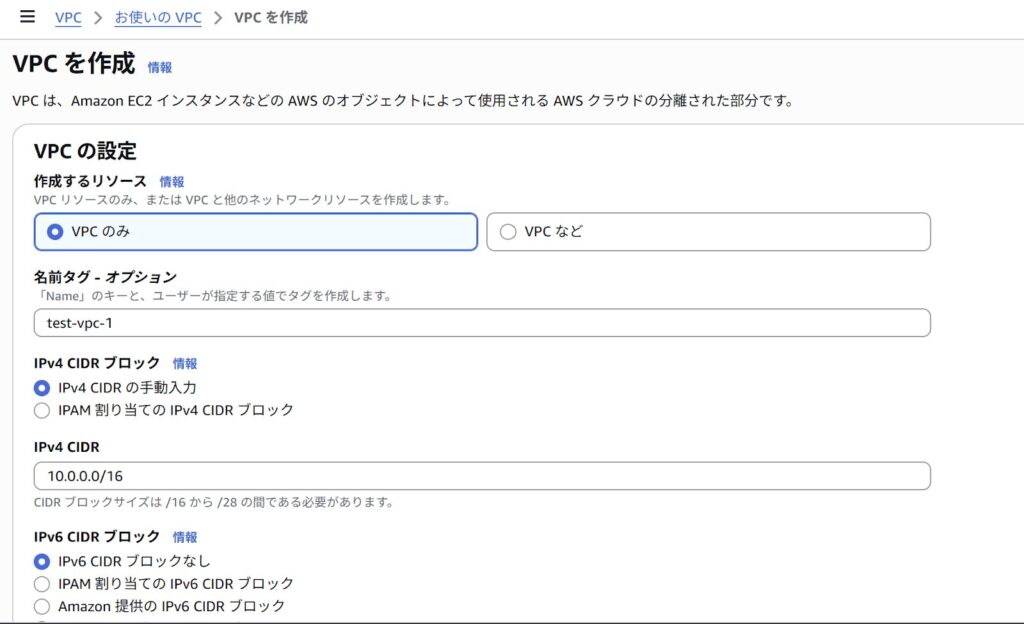 実案件では「test-vpc」といった適当な名前ではなく、[システム名]-[環境名]-[リソース名](例:my-app-prd-vpc)のようなルールを決めましょう。