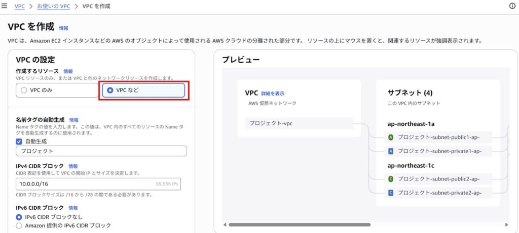 現在のAWSでは「VPCなど」というオプションを選択することで、VPC、サブネット、ルートテーブル、インターネットゲートウェイを数秒で一括作成できる「VPCウィザード」が標準となっています。
